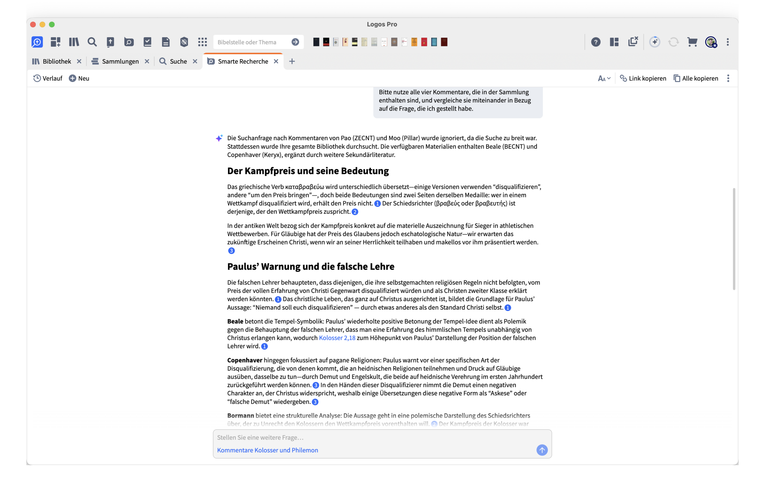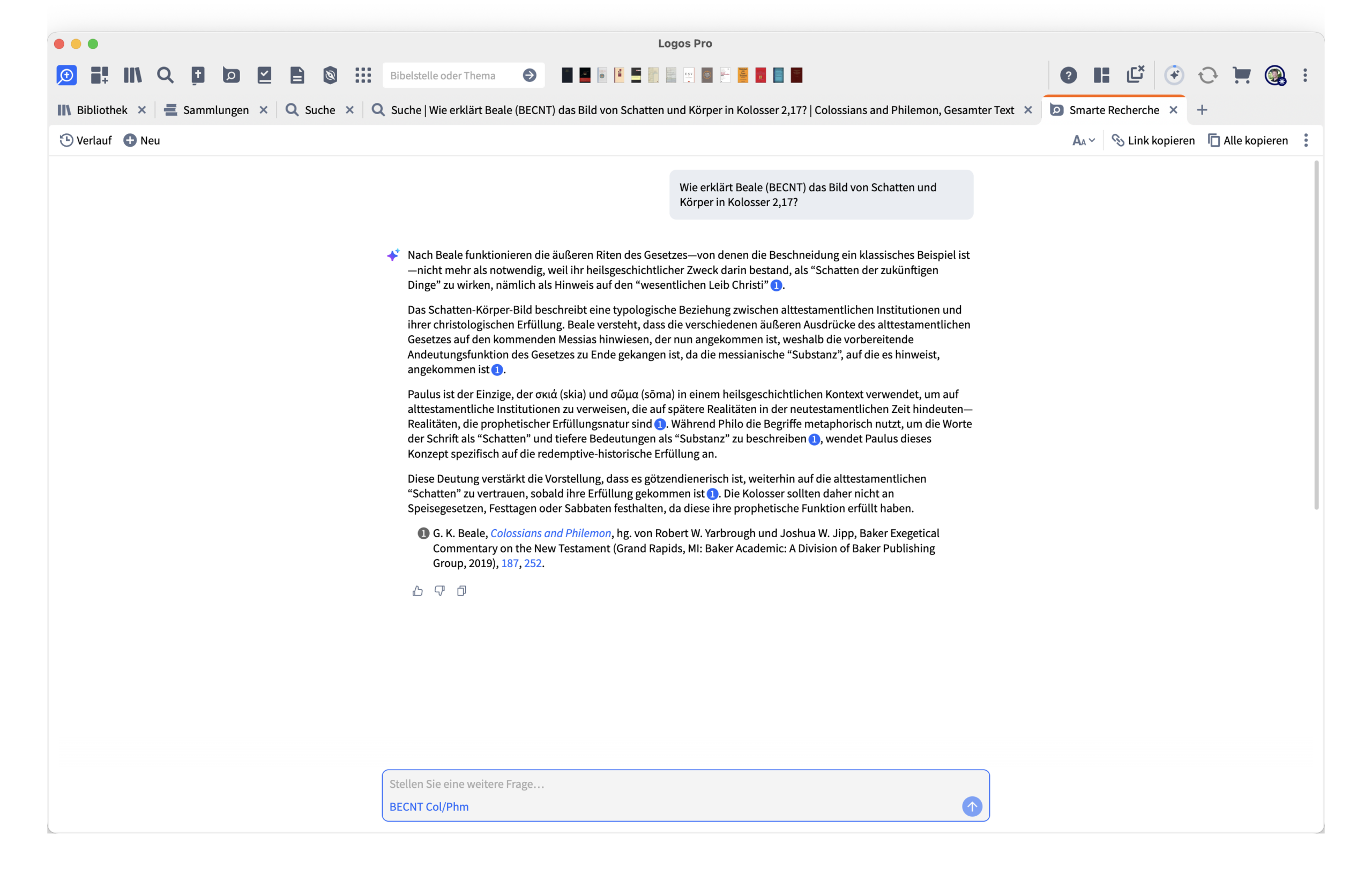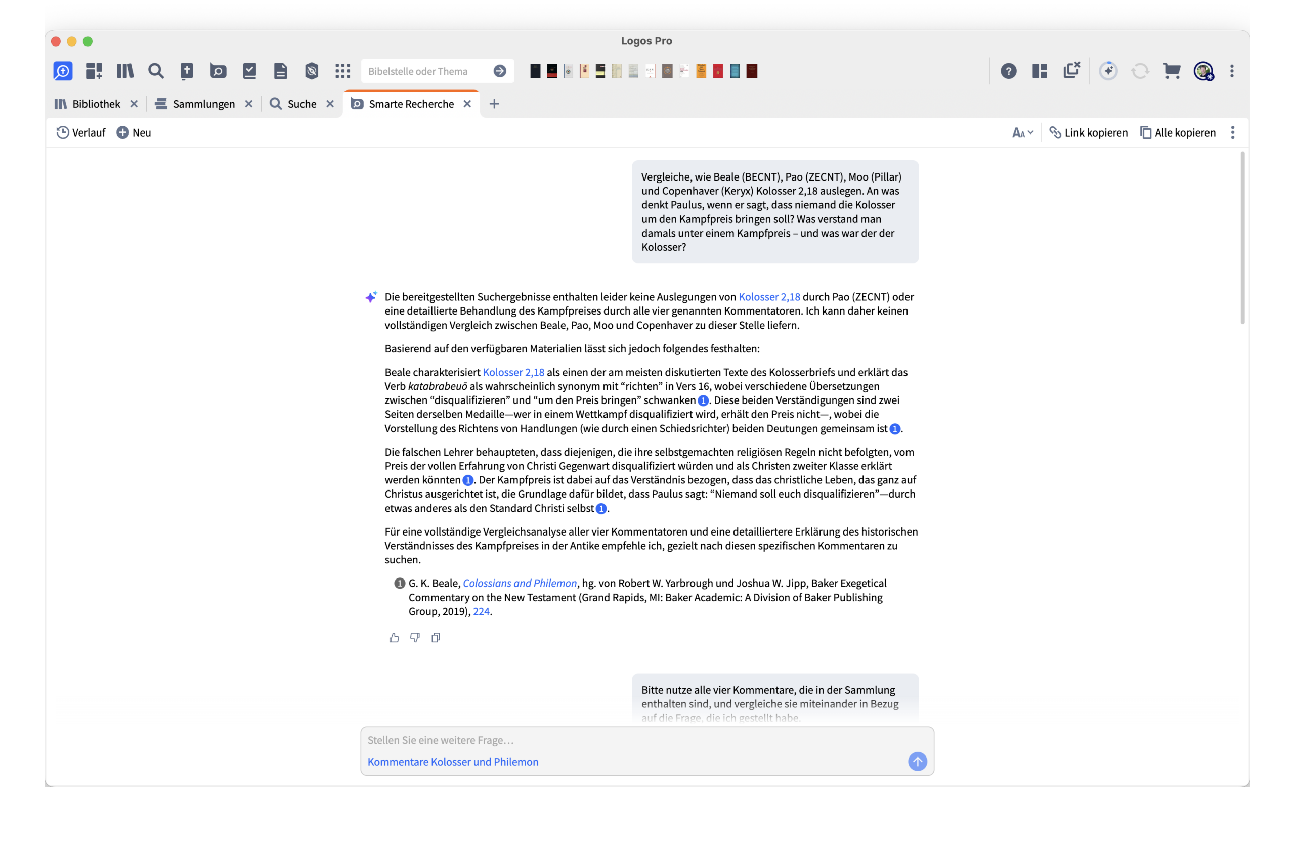 Ein zentraler Kritikpunkt meines ursprünglichen Artikels war, dass man keine gezielten Fragen an einzelne Bücher stellen könne. Genau das stimmt so nicht. Über die Suche kann man ein konkretes Werk auswählen und dieses direkt „befragen“. Ich habe das mit dem Beale-Kommentar zu Kolosser ausprobiert – genau mit der Frage, die ich auch im November formuliert hatte.