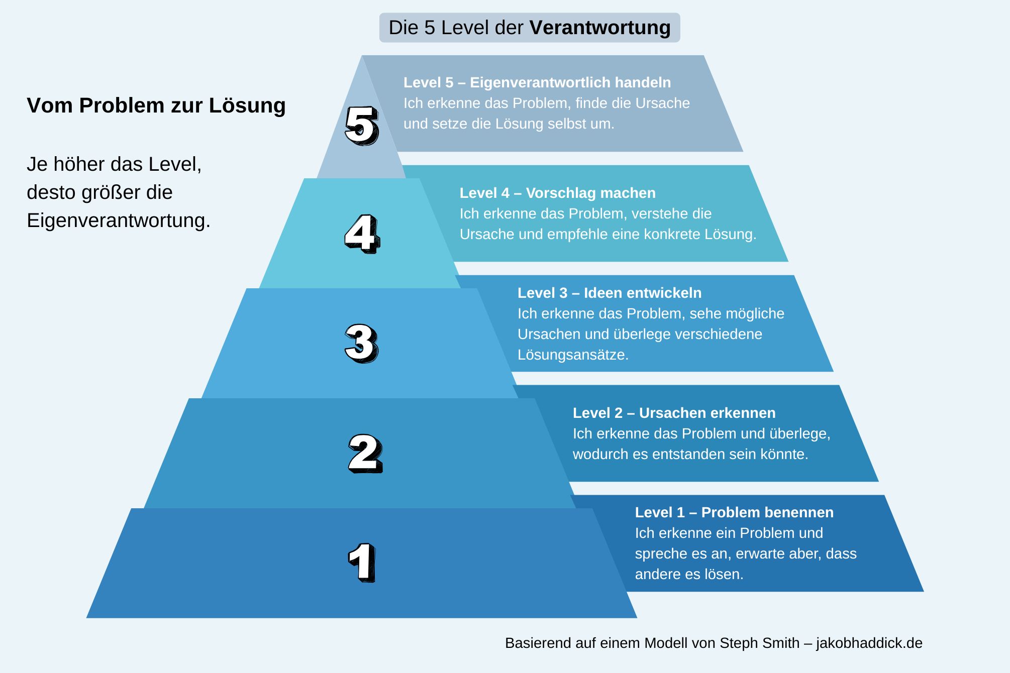 Neulich bin ich auf X (ehemals Twitter) auf einen Beitrag von Alex Lieberman gestoßen, der mich sofort angesprochen hat. Er beschreibt ein einfaches, aber sehr treffendes Modell von fünf Stufen, wie Menschen mit Problemen umgehen. Ursprünglich stammt es von Steph Smith, und es soll Mitarbeiter dazu anleiten, Verantwortung zu übernehmen – also nicht nur auf Missstände hinzuweisen, sondern aktiv Lösungen mitzugestalten.